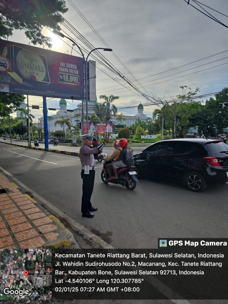 BONE,LinusTerkini.com- Setiap pagi terlihat banyak personel Satlantas Polres Bone berdiri di pinggir jalan di sejumlah titik dalam Kota Watampone, Kabupatn Bone, seperti pada Kamis (2/1/2025).