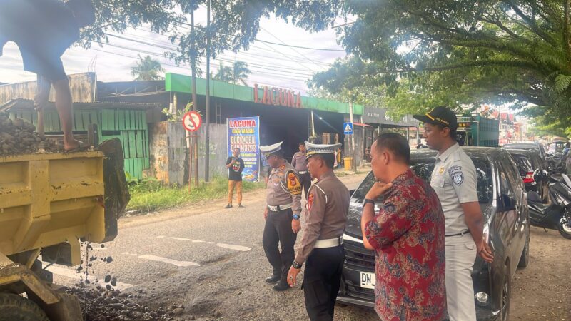 Personel Lantas yang biasa mengatur lalu lintas itu turut memainkan sekop, menutupi jalan berlubang dengan material batu koral.