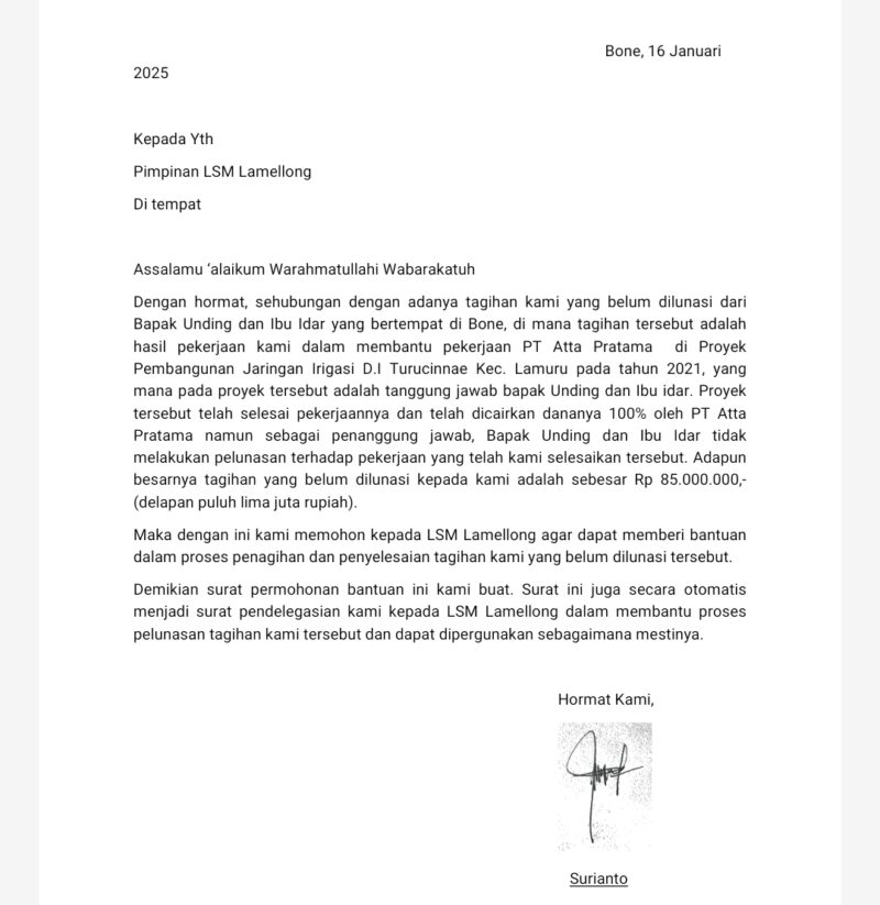 Dan dan kami tegaskan bahwa tercatat di saya masih ada 85 JT yg belum dilunasi ibu idar, dan sudah mengakui waktu diperiksa sama kejaksaan waktu itu,saya hanya di janji terus sampai sekarang belum dilunasi, dan kondisi saat ini saya sedang sakit, jadi saya minta tolong sama pak Rusdi ketua LSM Lamellong untuk membantu masalah ini, saya sdh beri surat kuasa ke pak Rusdi untuk membantu saya karena saya lagi sakit dan butuh biaya,”Cerita pak Surianto