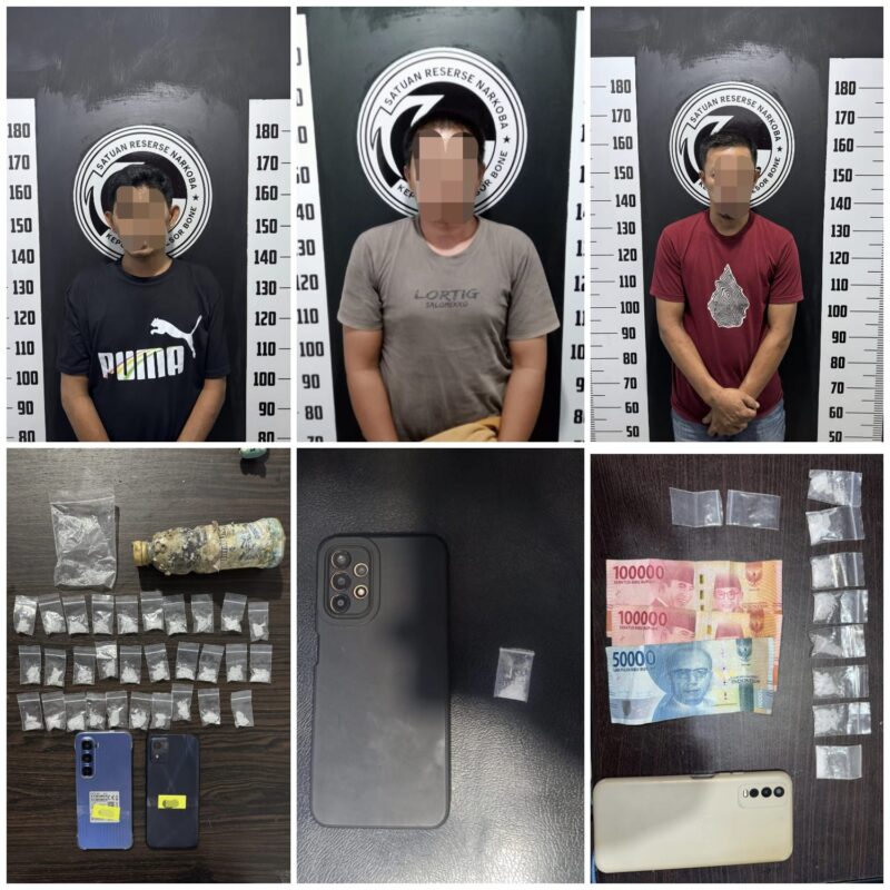 Kasatresnarkoba Polres Bone, Iptu Adityatama Firmansyah, S.Tr.K, melalui Kasihumas Polres Bone Iptu Rayendra Muchtar, S.H., menjelaskan bahwa penangkapan pertama dilakukan pada Jumat 12 September 2025 sekitar pukul 13.30 Wita di salah satu rumah kos di Jalan Gunung Bawakaraeng, Kelurahan Watampone, Kecamatan Tanete Riattang.