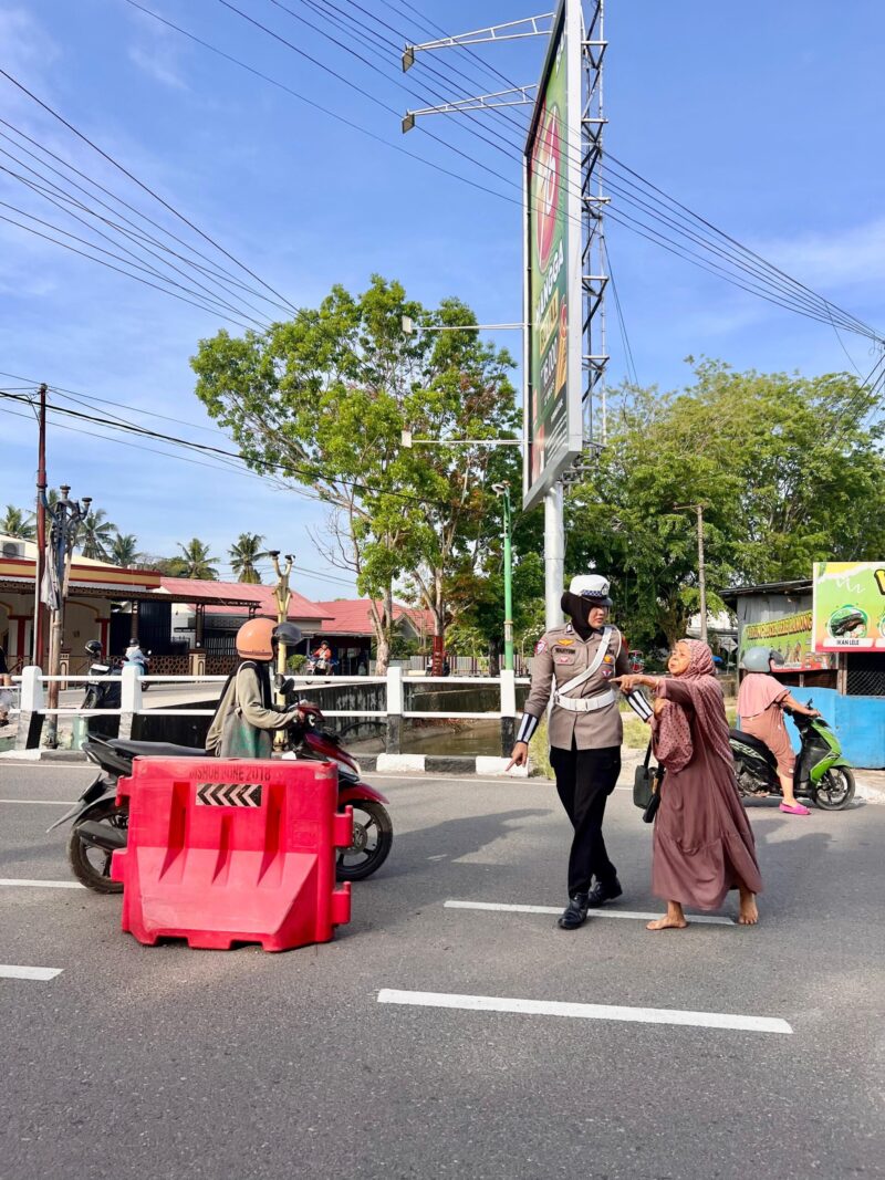 Polantas Bone Atur Lalu Lintas Pagi Hingga Bantu Seberangkan Warga