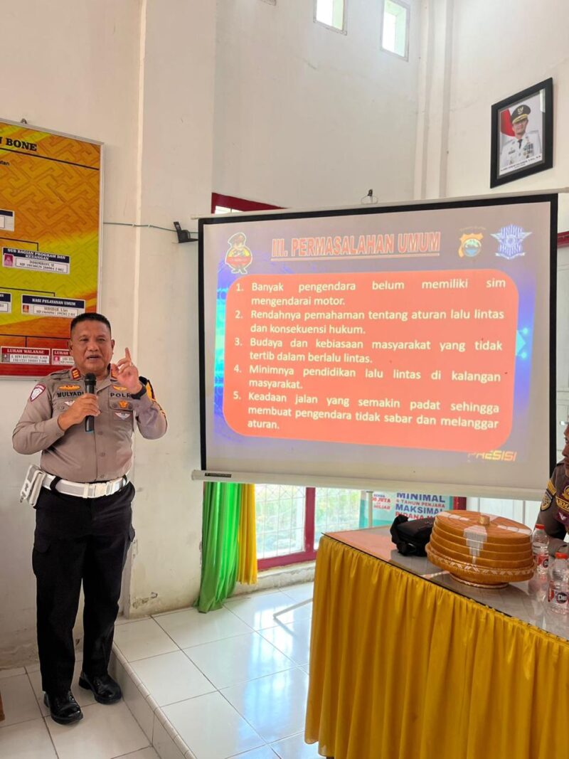 LinusTerkini.com– Kasat Lantas Polres Bone AKP Musmulyadi menyampaikan sosialisasi tertib berlalulintas dalam pertemuan yang digelar bersama Jasa Raharja dengan tema “Intensifikasi Keselamatan Transportasi Berbasis Domisili Korban Melalui Pemberdayaan Aparatur Kecamatan, Lurah dan Desa,” Rabu (19/11/2025).