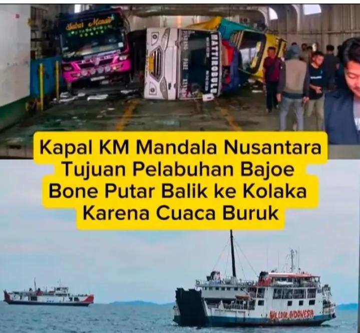 BONE,LinusTerkini.com-Kapal ferry KMP Mandala Nusantara yang melayani rute Pelabuhan Kolaka menuju Pelabuhan Bajoe terpaksa putar balik akibat cuaca buruk di perairan Selat Bone.