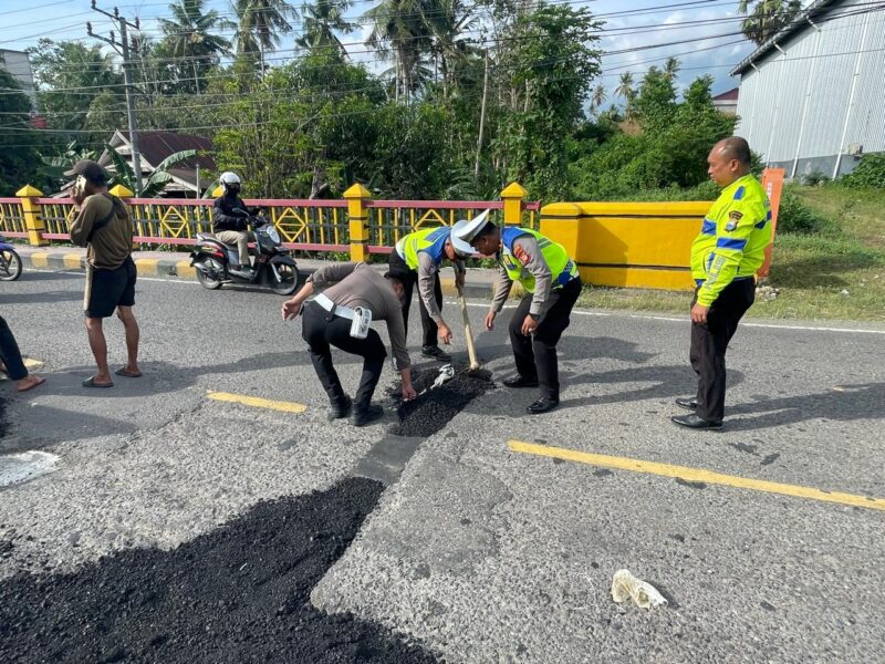 Dalam rangka Operasi Keselamatan Pallawa 2026 personel Satlantas Polres Bone melaksanakan kegiatan penambalan jalan rusak di area Jembatan Pasippo, Kecamatan Palakka, Kabupaten Bone.