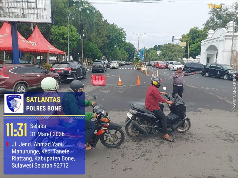 BONE, LinusTerkini.com- Personel Satlantas Polres Bone melaksanakan kegiatan pengaturan lalu lintas mencegah kemacetan lalu lintas di seputaran kota Watampone, dan SPBU Karella, Jl. Lapawowoi Karaeng sigeri, Kabupaten Bone, Selasa (31/3/2026).