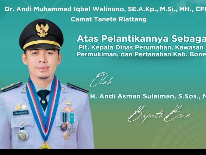 LinusTerkini.com— Dari camat Tanete riattang timur diangkat kembali menjabat sebagai Camat Tanete Riattang, Dr. Andi Muhammad Iqbal Walinono, S.E., A.Kp., M.Si., MH., CFRM kini kembali dipercaya mengembankan amanah baru sebagai Pelaksana Tugas (Plt.) Kepala Dinas Perumahan, Kawasan Permukiman dan Pertanahan (Disperkimtan) Kabupaten Bone.